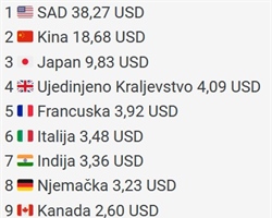 Tablica zaduženosti, javni dug po državama, izraženo u trilijunima američkih dolara