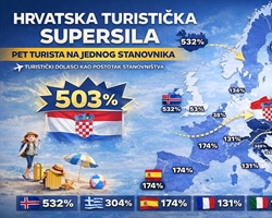 U vrijeme kada se europske ekonomije suočavaju s nizom izazova – od usporavanja rasta i inflacijskih pritisaka do geopolitičkih napetosti – jedna vizualizacija ponovno je skrenula pozornost međunarodne javnosti na iznimnu poziciju Hrvatske u europskom turizmu. Prema karti koju je objavila popularna stranica World GeoDemo na društvenim mrežama, Hrvatska se izdvaja kao apsolutna turistička supersila Europske unije kada se turistički dolasci promatraju u odnosu na broj stanovnika.