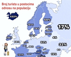 Karta prikazuje godišnje dolaske turista izražene kao postotak ukupnog stanovništva pojedine zemlje. Hrvatska je na toj karti označena tamno plavom bojom s impresivnih 503 posto, što znači da na svakog stanovnika dolazi čak pet turista godišnje. Takav odnos turističkih dolazaka i populacije Hrvatsku stavlja daleko ispred velikih turističkih sila poput Španjolske, Francuske ili Grčke, koje u apsolutnim brojkama primaju više gostiju, ali u relativnom odnosu prema stanovništvu zaostaju.
