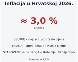 U hrvatskom slučaju 2026. se ne može promatrati kao godina povratka na „staru normalu“, nego kao prijelazno razdoblje u kojem se inflacija postupno približava europskom prosjeku, ali bez brzog izjednačavanja. Očekuje se da će se stopa inflacije u Hrvatskoj tijekom 2026. kretati oko tri posto, uz blago usporavanje u odnosu na 2025., dok bi tek tijekom 2027. mogla pasti bliže razini od dva posto. To znači da će Hrvatska i dalje imati višu inflaciju od prosjeka eurozone, unatoč činjenici da koristi istu valutu i istu monetarnu politiku.