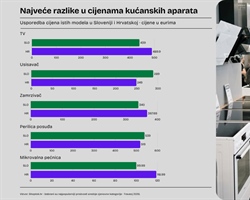 Slovenija pak bilježi niže cijene u svega četiri kategorije: televizoru, mikrovalnoj pećnici, zamrzivaču i hladnjaku, pri čemu je razlika kod hladnjaka gotovo simbolična.