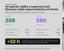 Prosječni hrvatski kupac za isti set najpopularnijih aparata mora odvojiti 2,44 plaće, a slovenski 2,24. Kada to prevedemo u sate rada, ispostavlja se da će Hrvat za košaricu kućanskih aparata odraditi oko 390 sati, a Slovenac oko 358, što je razlika od 32 sata, gotovo cijeli jedan radni tjedan.