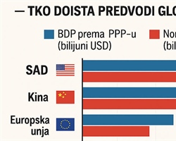 Mjerenje veličine nacionalne ekonomije oduvijek je bilo pitanje metodologije, a ne samo statistike. Na papiru, Sjedinjene Američke Države i dalje su najveće svjetsko gospodarstvo s nominalnim BDP-om od oko 28,5 bilijuna američkih dolara u 2025. godini. Kina se nalazi na drugom mjestu s približno 19,9 bilijuna dolara, što znači da prema nominalnom izrazu još nije pretekla SAD. Međutim, kada se ekonomska snaga mjeri prema paritetu kupovne moći (PPP) — pokazatelju koji uzima u obzir razlike u cijenama i životnim troškovima među zemljama — Kina već nekoliko godina drži čelnu poziciju s BDP-om koji premašuje 33 bilijuna dolara, naspram američkih oko 28 bilijuna.