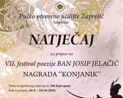 Dragi naši pjesnici koji neumorno slikate životne trenutke, najsnažnije emocije i uspomene svojim stihovima, pozivamo vas da se i ove godine pridružite VII. festivalu poezije BAN JOSIP JELAČIĆ i svojim stihovima dočarate svoju viziju ovogodišnje teme "𝐍𝐈𝐓 𝐊𝐎𝐉𝐀 𝐒𝐏𝐀𝐉𝐀"